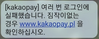 □ 개 요 o 최근 카카오페이를 사칭한 피싱 문자가 발견됨에 따라 개인정보 탈취 등으로 인한 2차 피해로 연계되지 않도록 사용자 주의 권고 □ 주요 내용 o 카카오페이 로그인이 실패하였다는 문자 내부 URL 클릭 시 카카오 페이를 사칭한 피싱 사이트로 연결되며 카카오톡 이메일 아이디 및 패스워드 입력 요구 * “[kakaopay] 여러 번 로그인에 실패했습니다. 짐작이 없는 경우 <URL>을 확인하세요” 문자 내용은 유사 형태로 변경될 수 있음 ![]() < 카카오페이 사칭 문자 >