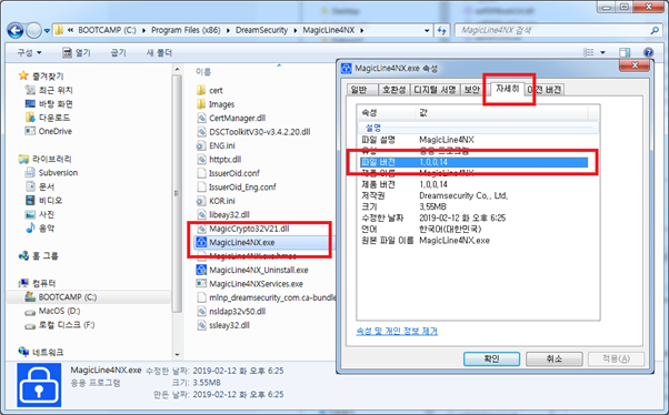 (2) MagicLine4NX에 마우스 오른쪽 버튼 클릭 – 속성 – 자세히 탭 클릭 – 파일 버전 확인 ![]()