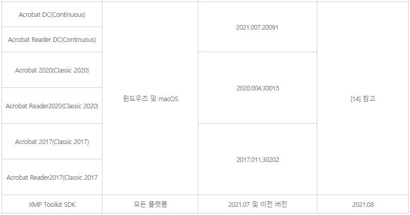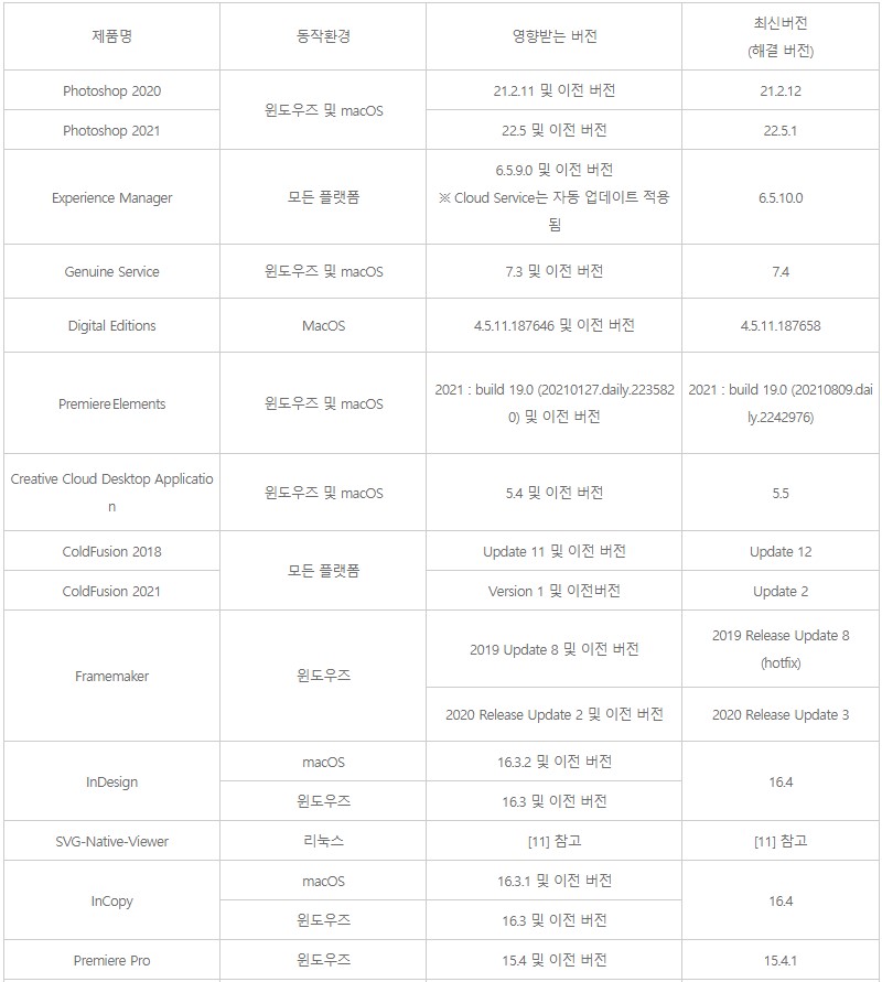 ![]() ※ 아래의 Adobe 참고사이트에서 “Solution”의 “Availability” 항목 참고하여 업데이트 수행 □ 기타 문의사항 o 한국인터넷진흥원 사이버민원센터: 국번없이 118