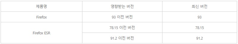 □ 개요 o 모질라 재단은 자사 제품에서 발생하는 취약점을 해결한 보안 업데이트 발표 [1] o 공격자는 해당 취약점을 악용하여 임의코드 실행 등의 피해를 발생시킬 수 있으므로, 최신버전으로 업데이트 권고 □ 설명 o Firefox에서 메모리 충돌로 인해 발생하는 임의코드실행 취약점(CVE-2021-38501) 등 7개 [2] o Firefox ESR에서 메모리 충돌로 인해 발생하는 임의코드실행 취약점(CVE-2021-38500) 등 6개 [3]