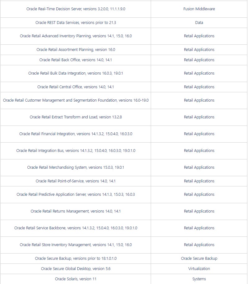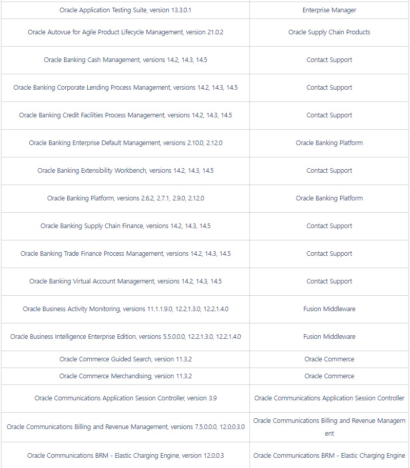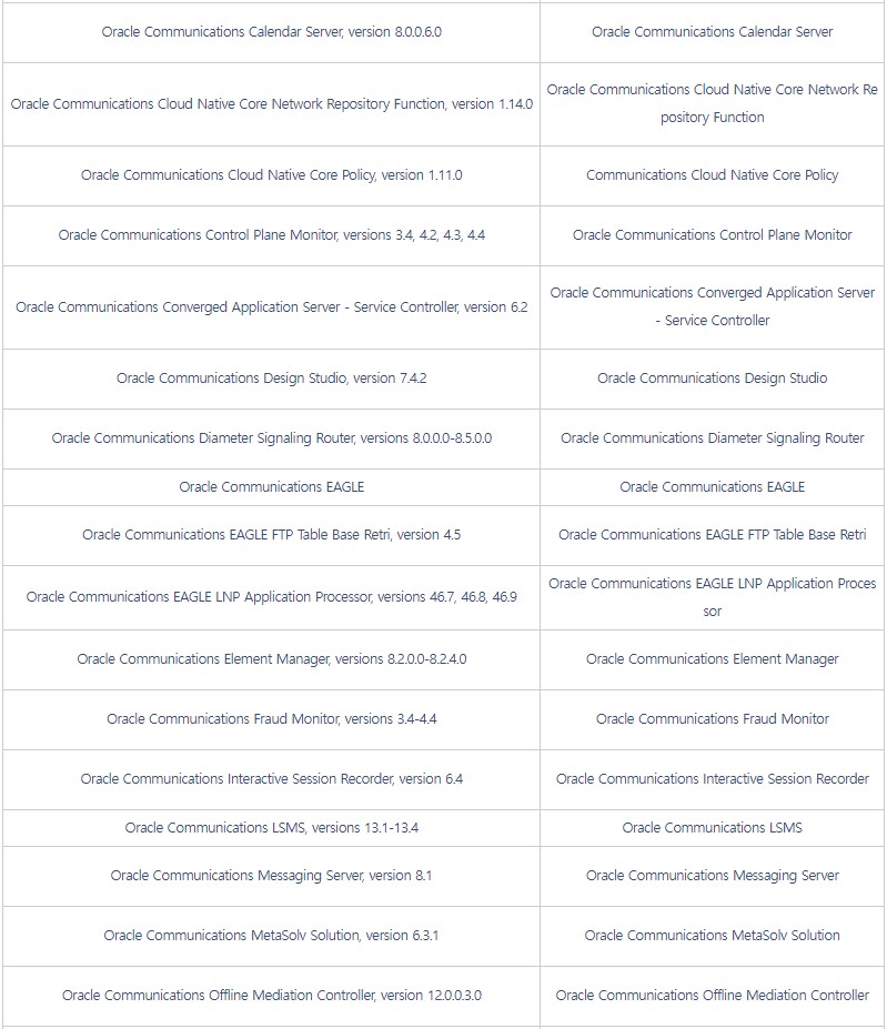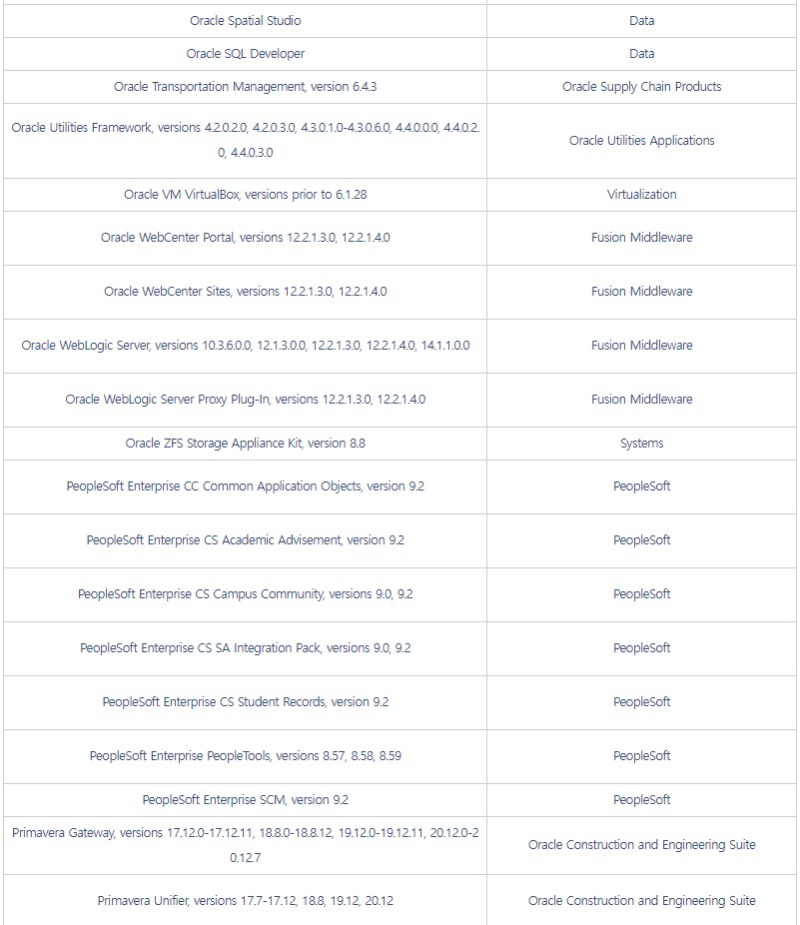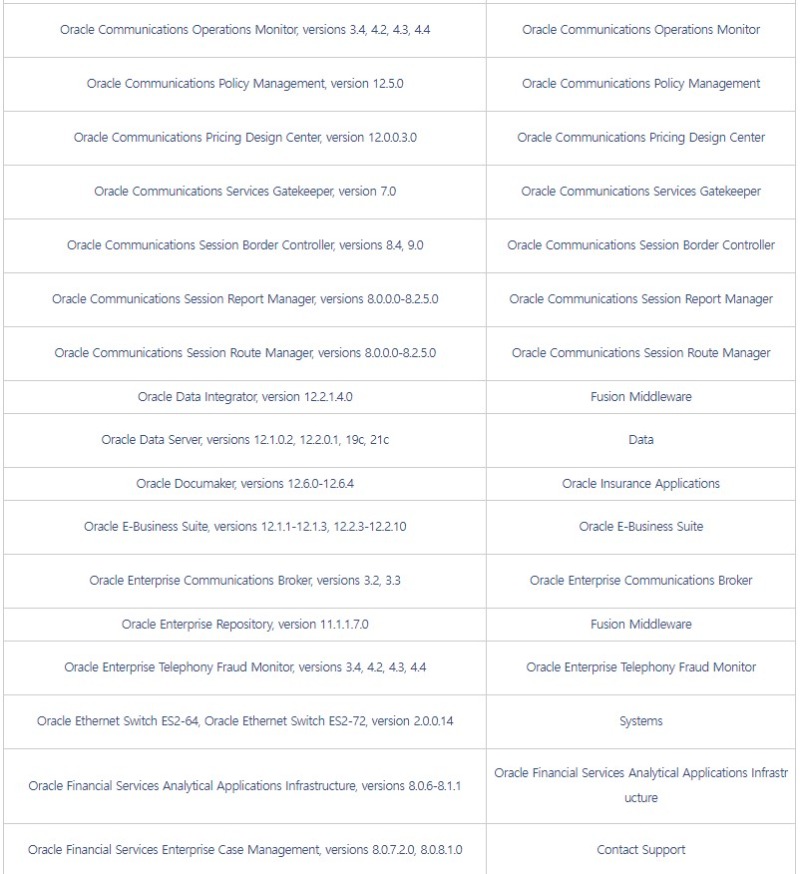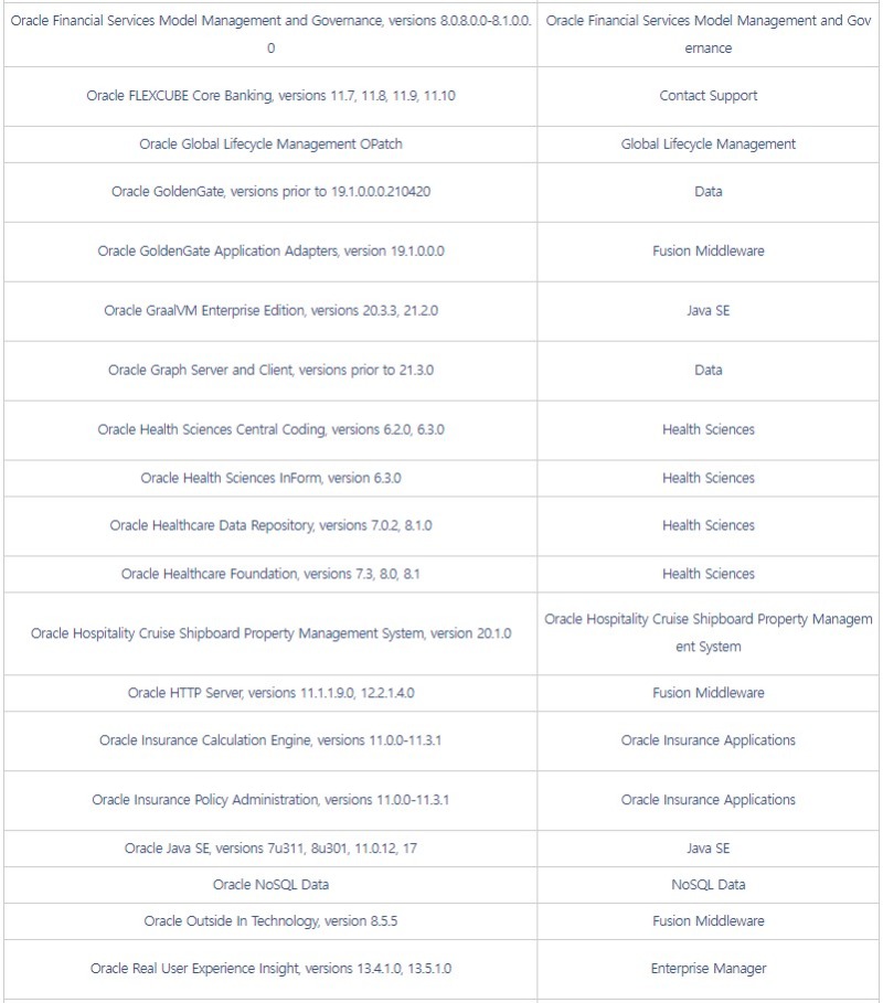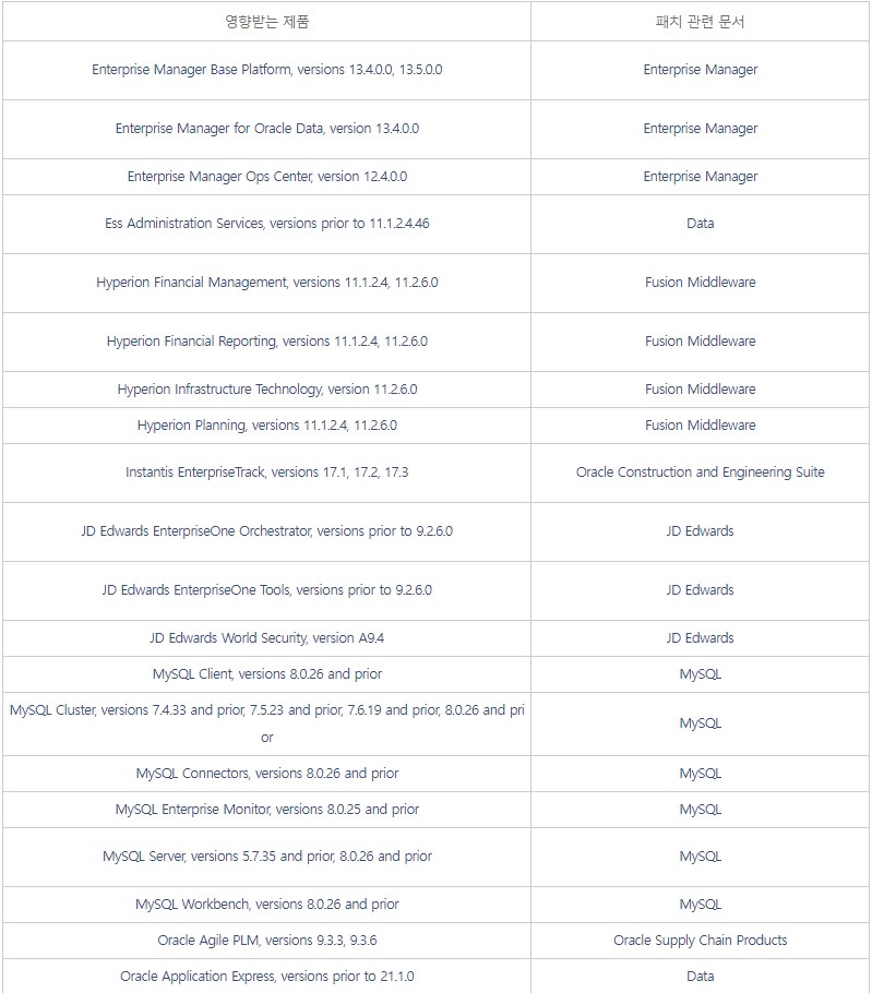 □ 개요 o 오라클社 CPU에서 자사 제품의 보안 취약점 419개에 대한 패치 발표 [1] ※ CPU(Critical Patch Update) : 오라클 중요 보안 업데이트 o 영향받는 버전의 사용자는 악성코드 감염 등에 취약할 수 있으므로, 아래 해결 방안에 따라 최신 버전으로 업데이트 권고 □ 영향받는 제품 및 버전 ![]()