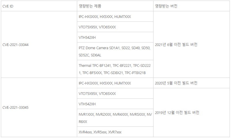 □ 개요 o Dahua社는 자사 제품에서 발생하는 취약점을 해결한 보안 업데이트 발표 [1] o 공격자는 해당 취약점을 악용하여 피해를 발생시킬 수 있으므로, 최신버전으로 업데이트 권고 □ 설명 o Dahua 카메라 제품에서 조작된 패킷을 전송하여 인증을 우회할 수 있는 취약점(CVE-2021-33044, 33045) [1] □ 영향받는 제품 ![]()