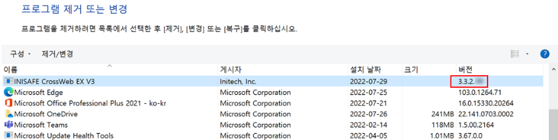 INISAFE CrossWeb EX V3가 설치되어 있는 경우 제거 후 최신버전 업데이트