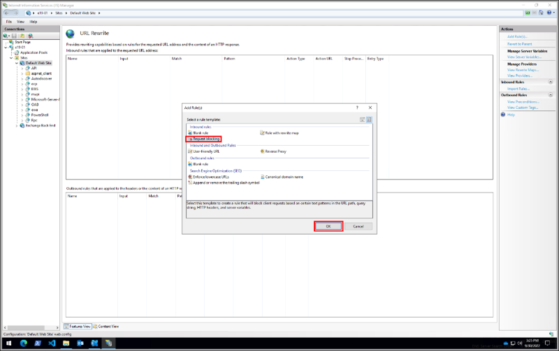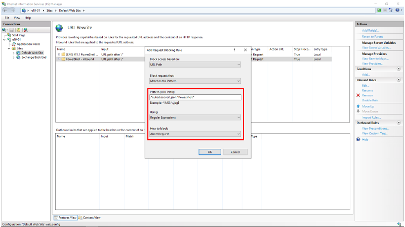 4. Pattern (URL Path) 항목에 “.*autodiscover\.json.*Powershell.*” 문자열 입력(쌍따옴표 제외) 5. Using 항목에 Reguler expressions 선택 6. How to block 항목에 Abort Request 선택