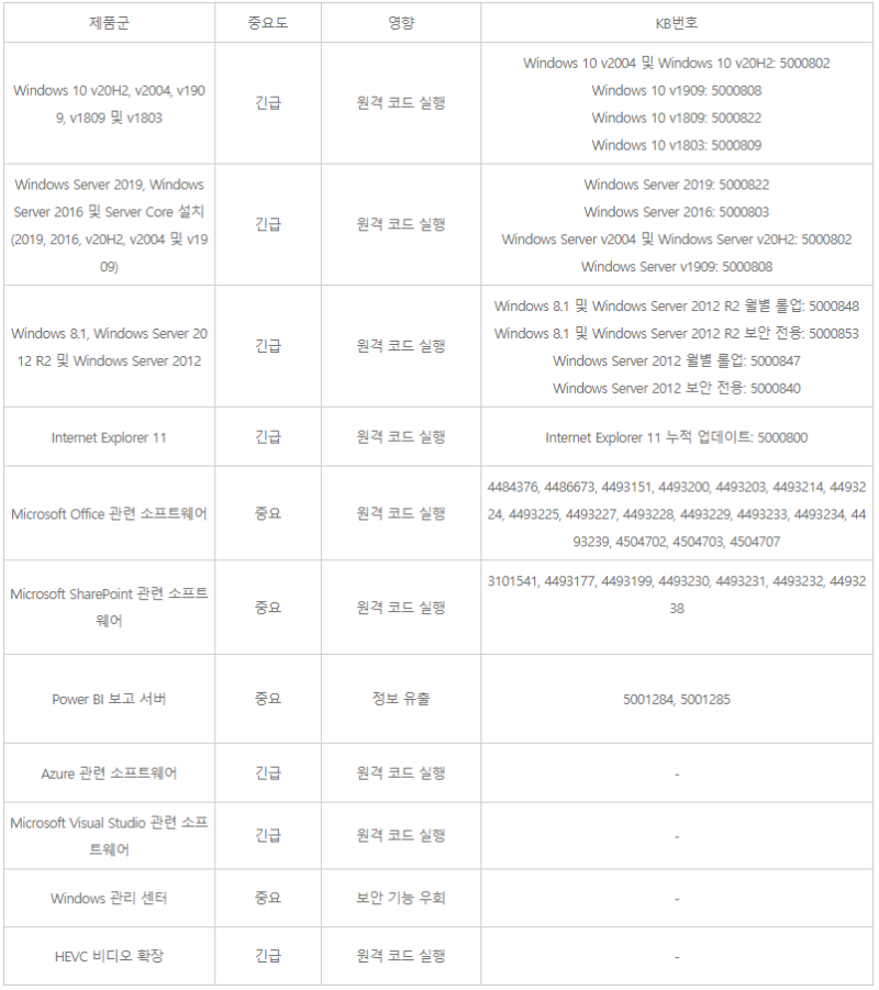 □ 3월 보안업데이트 개요(총 11종) o 등급 : 긴급(Critical) 7종, 중요(Important) 4종 o 발표일 : 2020.3.10.(수) o 업데이트 내용 ![]()