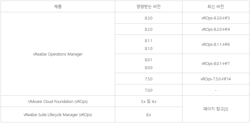 □ 영향받는 제품 및 해결 버전 ![]() ※ 참고사이트[1]에 명시되어 있는 ‘Reference’ 내용을 참고하여 패치 적용