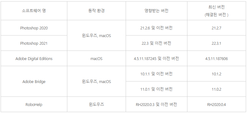 [참고사이트] [1] https://helpx.adobe.com/security.html [2] https://helpx.adobe.com/security/products/photoshop/apsb21-28.html [3] https://helpx.adobe.com/security/products/Digital-Editions/apsb21-26.html [4] https://helpx.adobe.com/security/products/bridge/apsb21-23.html [5] https://helpx.adobe.com/security/products/robohelp/apsb21-20.html