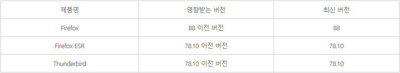 □ 기타 문의사항 o 한국인터넷진흥원 사이버민원센터: 국번없이 118 [참고사이트] [1] https://www.mozilla.org/en-US/security/advisories/mfsa2021-16/ [2] https://www.mozilla.org/en-US/security/advisories/mfsa2021-15/ [3] https://www.mozilla.org/en-US/security/advisories/mfsa2021-14/ [4] https://supp □ 작성 : 침해사고분석단 취약점분석팀 |