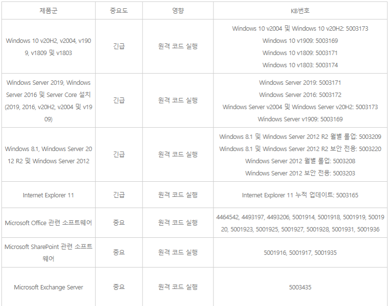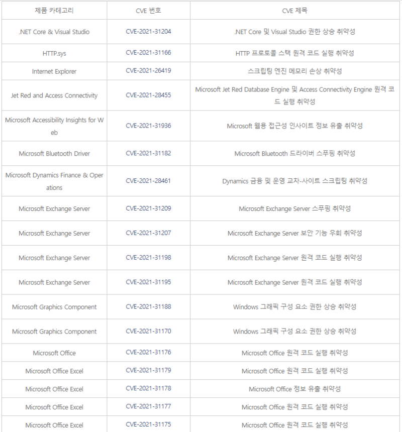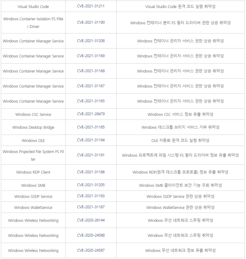 □ 5월 보안업데이트 개요(총 11종) o 등급 : 긴급(Critical) 4종, 중요(Important) 7종 o 발표일 : 2021.5.12.(수) o 업데이트 내용 ![]() ![]()