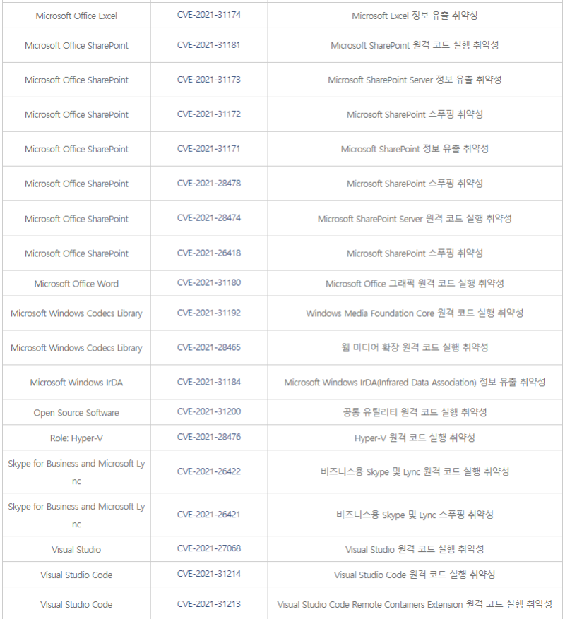 [참고 사이트] [1] (한글) https://portal.msrc.microsoft.com/ko-kr/security-guidance [2] (영문) https://portal.msrc.microsoft.com/en-us/security-guidance [3] https://msrc.microsoft.com/update-guide/releaseNote/2021-May [4] https://msrc.microsoft.com/update-guide o 취약점 요약 정보 ![]() ![]() ![]()