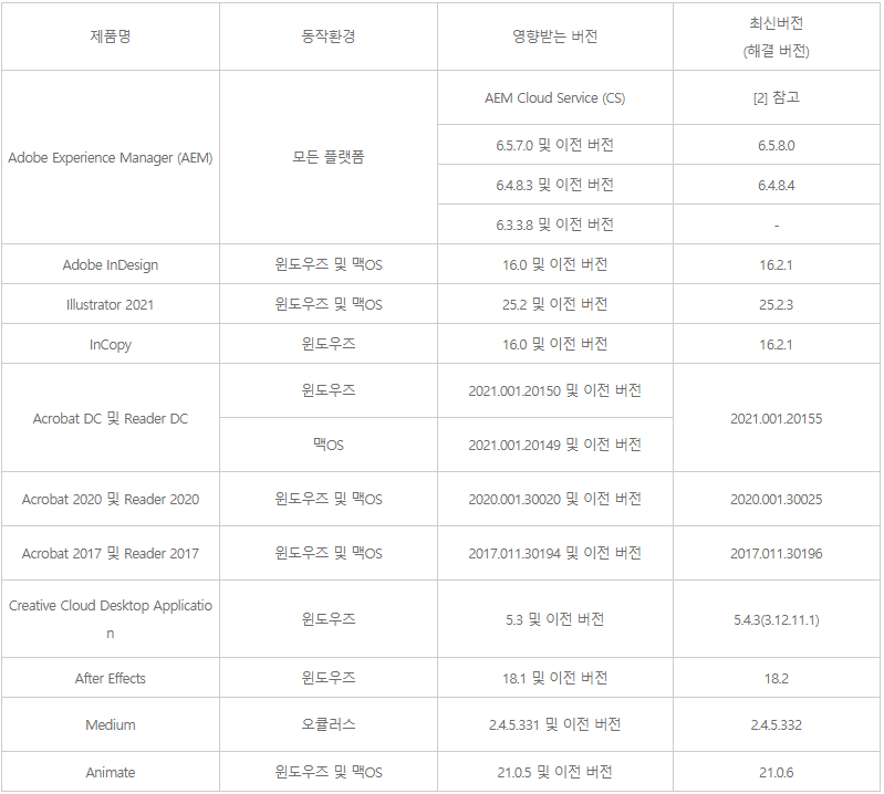 [참고사이트] [1]https://helpx.adobe.com/security.html [2] https://helpx.adobe.com/security/products/experience-manager/apsb21-15.html [3] https://helpx.adobe.com/security/products/indesign/apsb21-22.html [4] https://helpx.adobe.com/security/products/illustrator/apsb21-24.html [5] https://helpx.adobe.com/security/products/incopy/apsb21-25.html [6] https://helpx.adobe.com/security/products/acrobat/apsb21-29.html [7] https://helpx.adobe.com/security/products/creative-cloud/apsb21-31.html [8] https://helpx.adobe.com/security/products/after_effects/apsb21-33.html [9] https://helpx.adobe.com/security/products/medium/apsb21-34.html [10] https://helpx.adobe.com/security/products/animate/apsb21-35.html