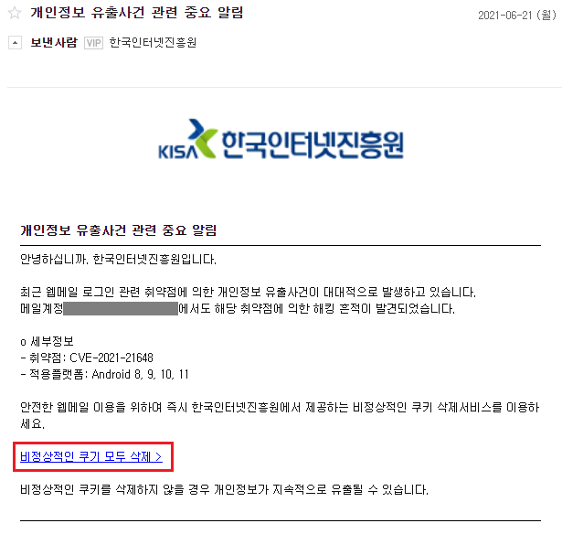 □ 개 요 o 지난 5월 유포된 한국인터넷진흥원 사칭 해킹 메일과 동일한 형태의 해킹 메일이 또 다시 유포되고 있어 인터넷 이용자들의 주의가 요구됨 □ 주요 내용 o 한국인터넷진흥원을 사칭하여 '개인정보 유출사건 관련 중요 알림'이라는 제목으로 피싱 메일이 유포되고 있으며, 해킹된 메일 계정 조치를 위해 본문에 삽입된 링크를 클릭하도록 유도 - 지난 5월 유포된 한국인터넷진흥원 사칭 해킹 메일의 내용과 흡사하나 본문의 링크 클릭시 연결되는 피싱 페이지는 다른 것으로 확인됨 * 관련 보안공지 : 한국인터넷진흥원 사칭 피싱 이메일 주의 권고(5.11, 보호나라)