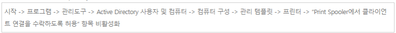 o 선택2. 그룹 정책(Group Policy) 설정을 사용하여 원격 프린팅 중지 ![]() ※ 설정 적용을 위해 Print Spooler 서비스의 재시작이 필요하며, 해당 설정 적용 시 원격 프린트 서버 기능이 중단되므로 조직 영향도를 파악하여 적용 필요
