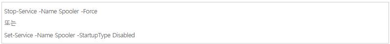 □ 임시 대응 방안 o 선택1. Print Spooler 서비스 중지 - 파워셸 실행 후 아래의 명령어 실행 ![]()