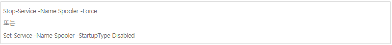 □ 임시 대응 방안 o Print Spooler 서비스 중지 - 파워셸 실행 후 아래의 명령어 실행 ![]() ※ 해당 설정 적용 시 원격 프린트 서버 기능이 중단되므로 조직 영향도를 파악하여 적용 필요 □ 기타 문의사항 o 한국인터넷진흥원 사이버민원센터: 국번 없이 118