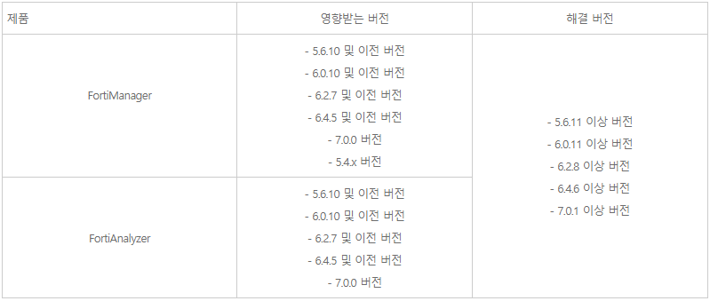□ 영향받는 제품 및 해결 방안 o 취약점이 해결된 버전으로 업데이트 적용 ![]()
