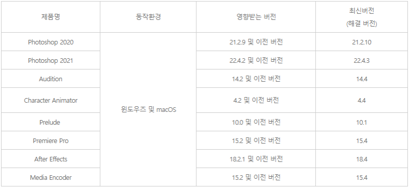 [참고사이트] [1] https://helpx.adobe.com/security.html [2] https://helpx.adobe.com/security/products/photoshop/apsb21-63.html [3] https://helpx.adobe.com/security/products/audition/apsb21-62.html [4] https://helpx.adobe.com/security/products/character_animator/apsb21-59.html [5] https://helpx.adobe.com/security/products/prelude/apsb21-58.html [6] https://helpx.adobe.com/security/products/premiere_pro/apsb21-56.html [7] https://helpx.adobe.com/security/products/after_effects/apsb21-54.html [8] https://helpx.adobe.com/security/products/media-encoder/apsb21-43.html □ 작성 : 침해사고분석단 취약점분석팀