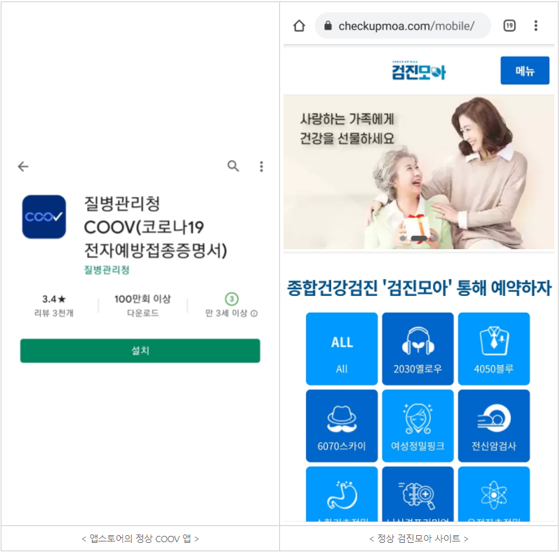 □ 질병관리청 정상 문자 및 앱 o (질병관리청 정상 안내 문자 관련) 질병관리청 문자는 010을 사용하지 않으며 1339 또는 질병관리청 전화번호로만 발송됨, 또한 사전 예약 시스템을 통한 경우를 제외하면 개인정보를 일체 요구하지 않음 o (질병관리청 정상 앱 관련) 질병관리청의 전자예방접종 증명서(COOV)는 사용자가 직접 앱스토어 등에서 다운로드받아야 하며 질병관리청이 별도로 인터넷 접속 주소(URL 링크)를 보내지 않음 ![]()