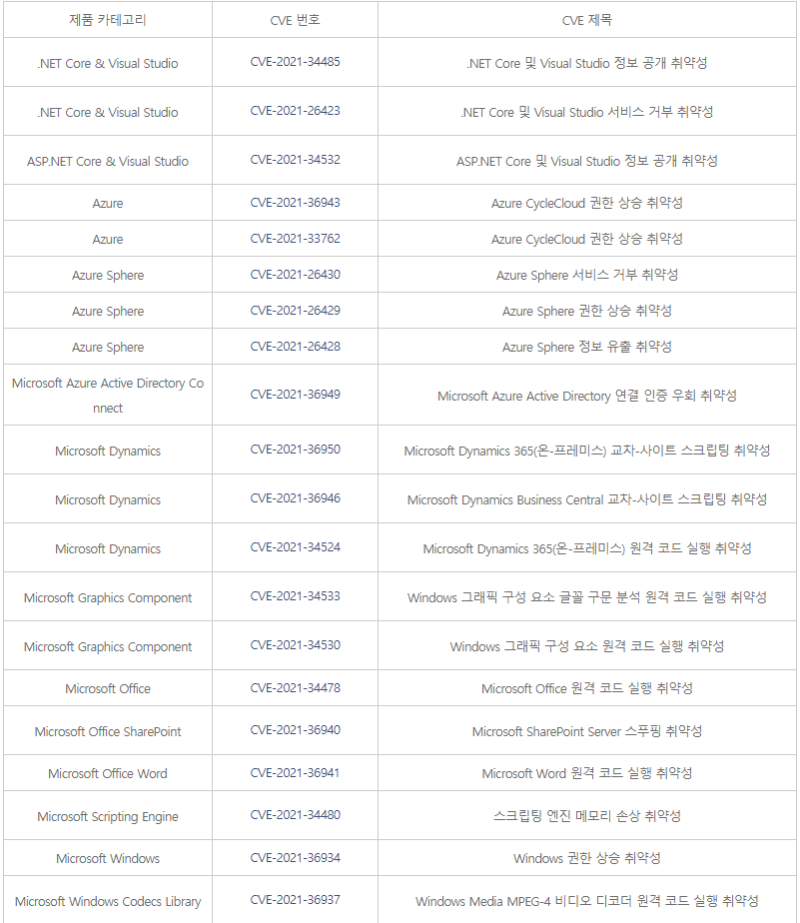 [참고 사이트] [1] (한글) https://portal.msrc.microsoft.com/ko-kr/security-guidance [2] (영문) https://portal.msrc.microsoft.com/en-us/security-guidance [3] https://msrc.microsoft.com/update-guide/releaseNote/2021-Aug [4] https://msrc.microsoft.com/update-guide o 취약점 요약 정보 ![]() ![]() ![]()