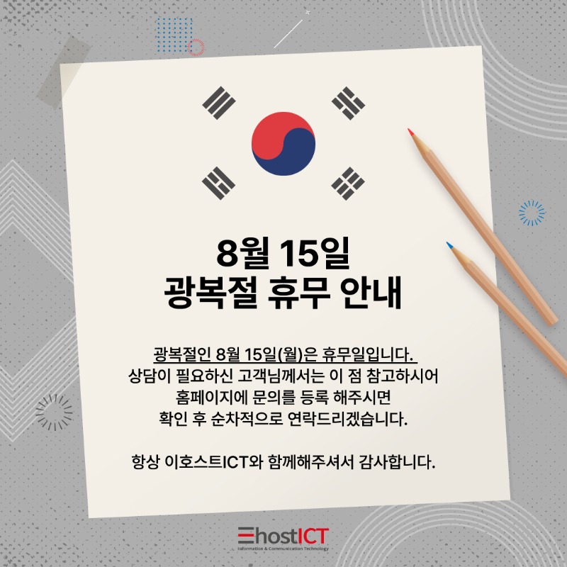 [공지] 8월 15일 광복절 휴무 안내 ⠀ 광복절인 8월 15일(월)은 휴무일입니다. 상담이 필요하신 고객님께서는 이 점 참고하시어 홈페이지에 문의를 등록 해주시면 확인 후 순차적으로 연락드리겠습니다. ⠀ ⠀ *365일 보안 관제를 위해 ICT 운영팀은 정상 운영 됩니다. 안정적인 서비스 제공을 약속 드립니다. ⠀ 항상 이호스트ICT와 함께해주셔서 감사합니다. ⠀ ⠀ -이호스트ICT 드림- |