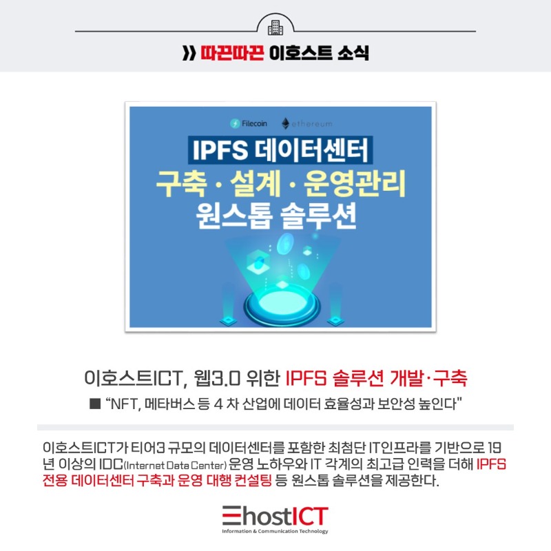 | 다음글 | 이호스트ICT, 웹3.0 위한 IPFS 솔루션 개발·구축에 IT 인프라 확충 주력 |