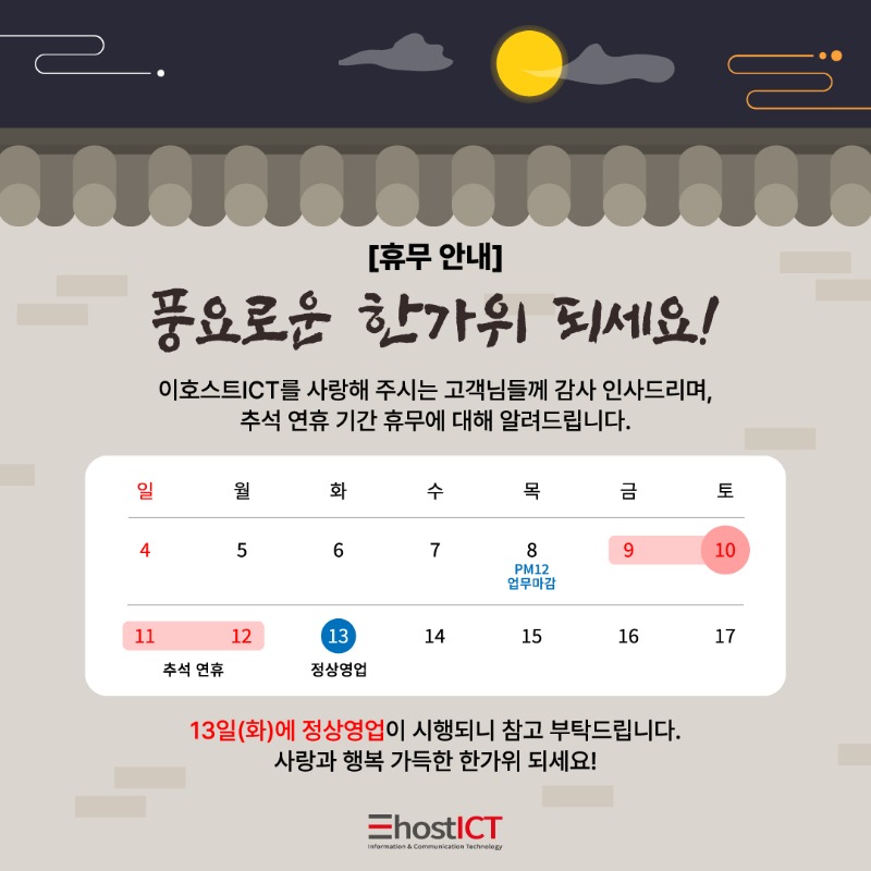 이호스트ICT를 사랑해 주시는 고객님들께 감사 인사드리며, 추석 연휴 기간 휴무에 대해 알려드립니다. *9/8일 목요일은 오전 근무만 시행할 예정이오니 참고 바랍니다. ■휴무 시작 : 2022.09.08.(목요일) 오후12시~ ■정상 영업 : 2022.09.13.(화요일) 13일(화)에 정상영업이 시행되니 참고 부탁드립니다. 사랑과 행복 가득한 한가위 되세요! |