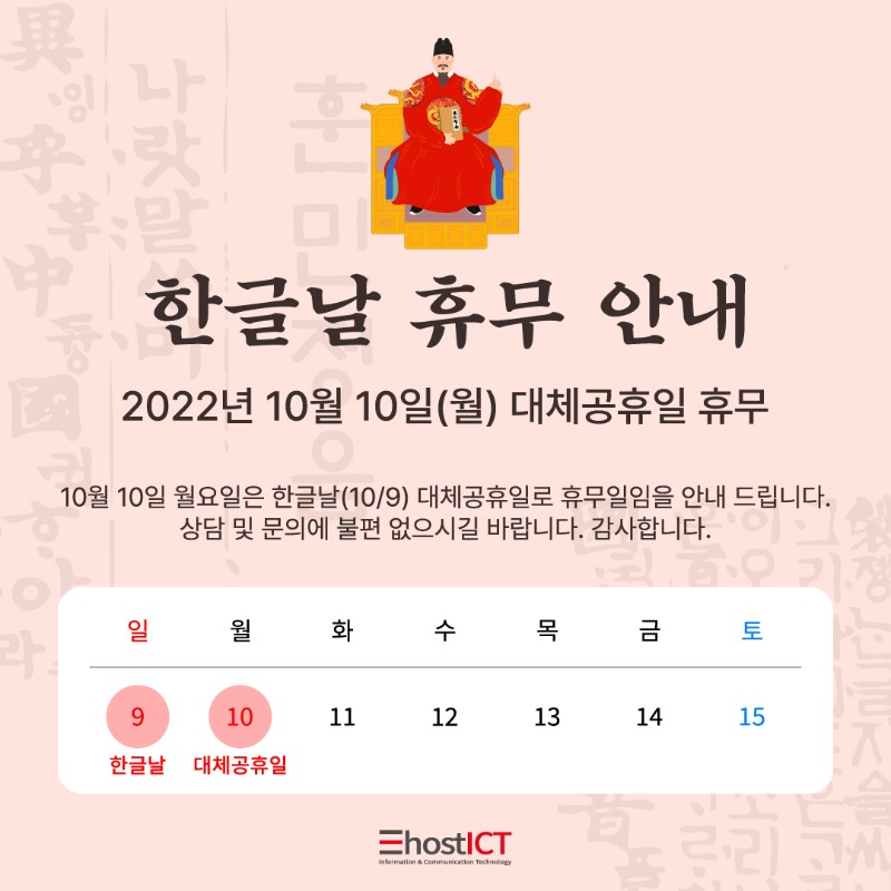 ![]() 세상에서 가장 아름다운 우리 글자 한글 창제를 기념하고 한글의 우수성을 알리기 위한 국경일 '한글날(10/9)'을 맞이하여 이호스트IDC가 잠시 쉬어갑니다. ⠀ 10월 10일(월) 대체공휴일에는 IDC 센터 운영팀을 제외한 상담/문의 서비스 제공이 어려울 예정이오니 착오 없으시기를 바랍니다. ⠀ 늘 이호스트IDC를 성원해 주셔서 감사드립니다. 즐거운 연휴 되십시오. ⠀ ⠀ - 이호스트IDC - |