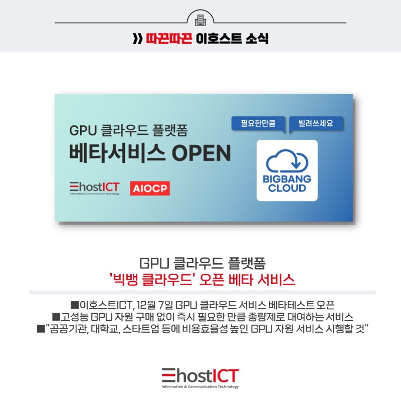 | 다음글 | 이호스트ICT, GPU 클라우드 플랫폼 '빅뱅 클라우드' 오픈 베타 테스트 |