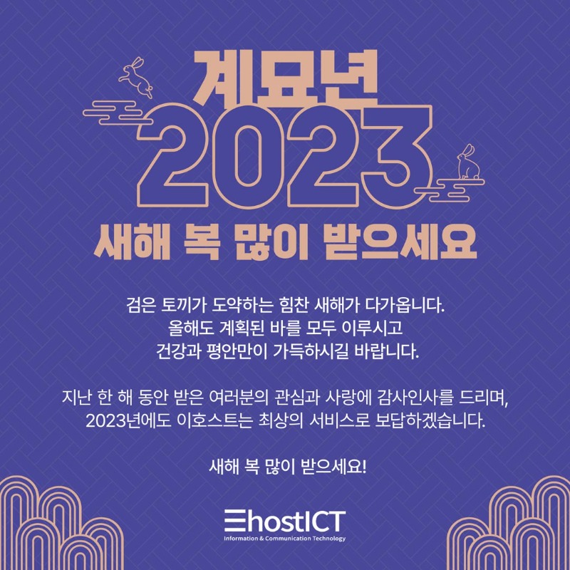 ⠀ 검은 토끼가 도약하는 힘찬 새해가 다가옵니다. 올해도 계획된 바를 모두 이루시고 건강과 평안만이 가득하시길 바랍니다. 지난 한 해 동안 받은 여러분의 관심과 사랑에 감사인사를 드리며, 2023년에도 이호스트는 최상의 서비스로 보답하겠습니다. 새해 복 많이 받으세요! ⠀ -이호스트ICT 드림- ⠀ ⠀ |