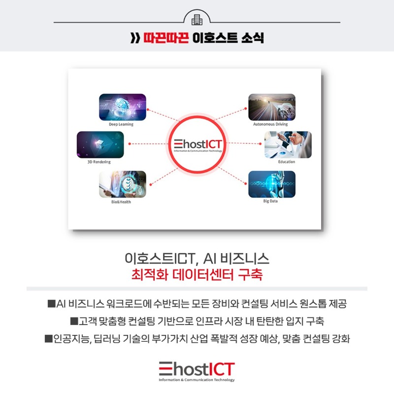 | 다음글 | 이호스트ICT, AI 비즈니스 최적화 데이터센터 구축 |