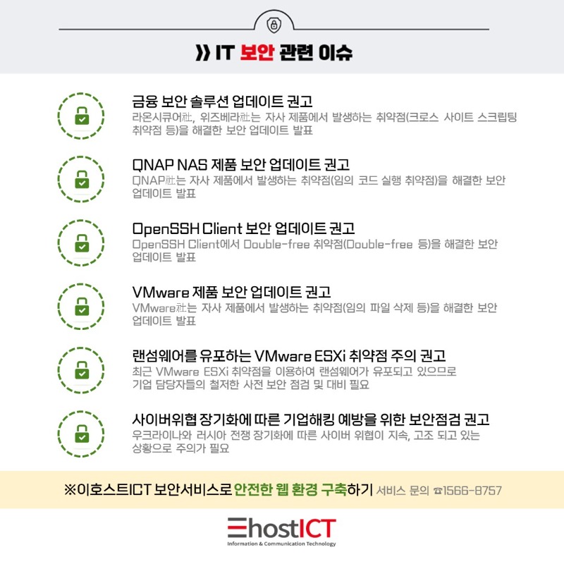 ㈜이호스트아이씨티는 백신 프로그램 및 악성코드 방어 소프트웨어을 이용하여 컴퓨터 바이러스에 의한 피해를 방지하고 있으며, 해당 소프트웨어는 매일 주기적으로 업데이트하고 있습니다.