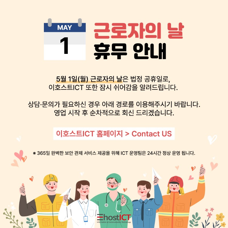 ![]() 2023년 5월 1일(월) 근로자의 날은 법정 공휴일로, 이호스트ICT 또한 잠시 쉬어감을 알려드립니다. 상담/문의가 필요하신 경우 아래 경로를 이용해 예약해주시기 바랍니다. 영업 시작 후 순차적으로 회신 드리겠습니다. 이호스트ICT 홈페이지 ▷ Contact US https://www.ehostidc.co.kr/cscenter/consulting ※365일 완벽한 보안 관제 서비스를 위해 ICT 운영팀은 24시간 정상 운영 됩니다. |