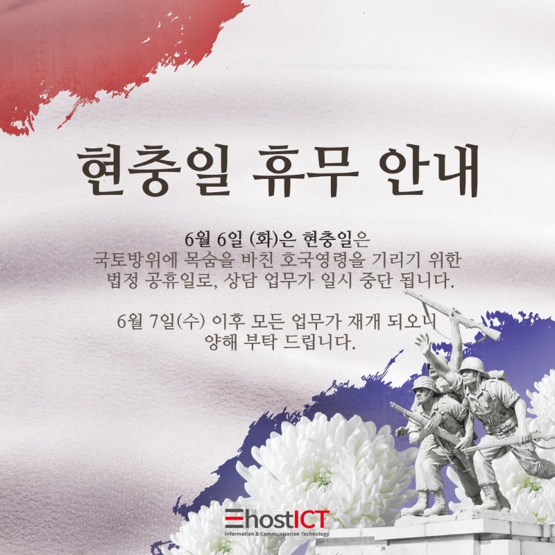 6월 6일(화) 현충일은 국토방위에 목숨을 바친 호국영령을 기리기 위한 법정 공휴일로, 상담 업무가 일시 중단 됩니다. ⠀ 6월 7일 (수) 이후 모든 업무가 재개 되오니 양해 부탁 드립니다. ⠀ *365일 완벽한 보안 관제 서비스를 위해 ICT 운영팀은 휴무 기간 내에도 정상 운영 됩니다. -이호스트ICT 드림- |