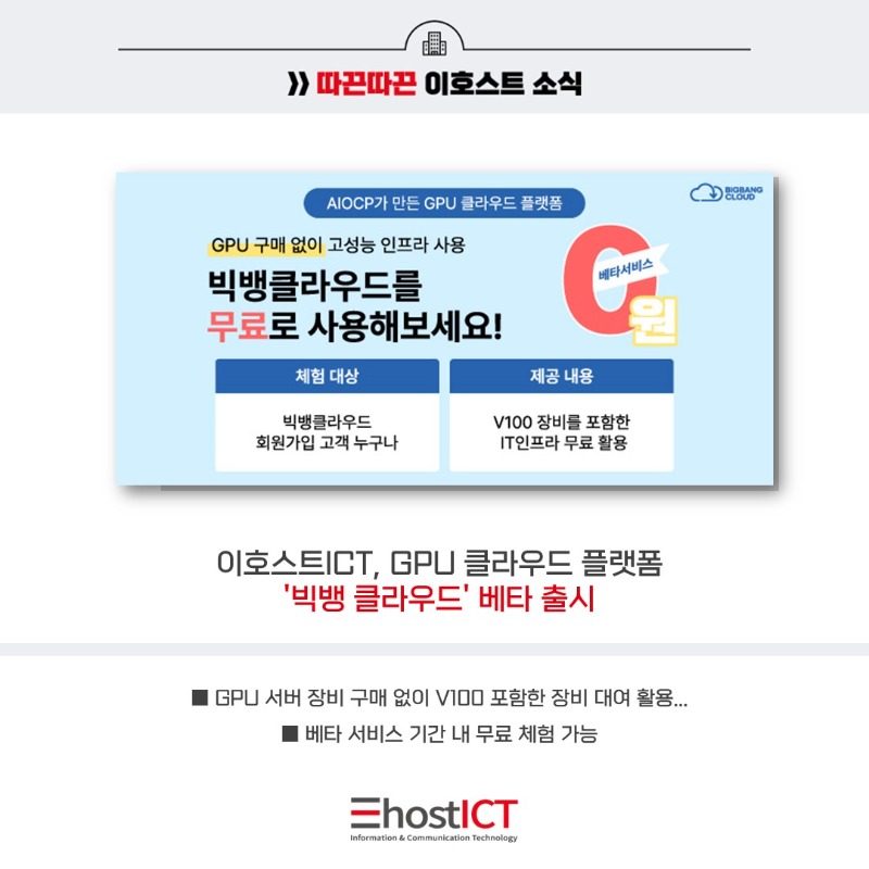 | 다음글 | 이호스트ICT, GPU 클라우드 플랫폼 '빅뱅 클라우드' 베타 출시 |