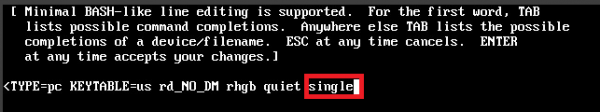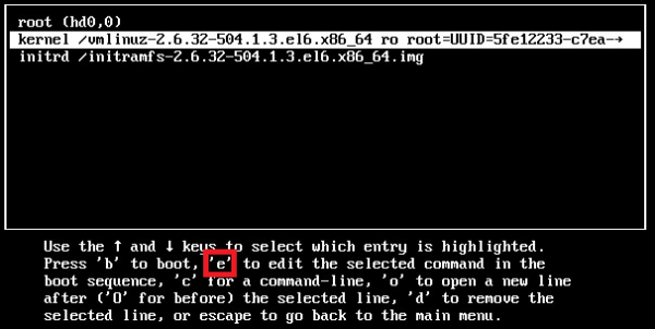 2. 커널 선택화면에서 e 입력 ![]() 3. Kernel 화면에서 e 입력 ![]() 4. 끝에 single 또는 1 입력 ![]() 5. Enter 입력 후 부팅 후 패스워드 리셋 진행 |