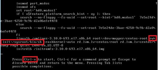 4. ro 를 rw init=/sysroot/bin/sh 로 수정 수정 완료 후 Ctrl-x 또는 F10 누르기 ![]()