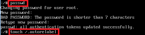 6. 패스워드 변경 # passwd selinux 업데이트 # touch /.autorelabel selinux 설정이 disable 인 경우 touch /.autorelabel 실행 안해도 됨. ![]() |