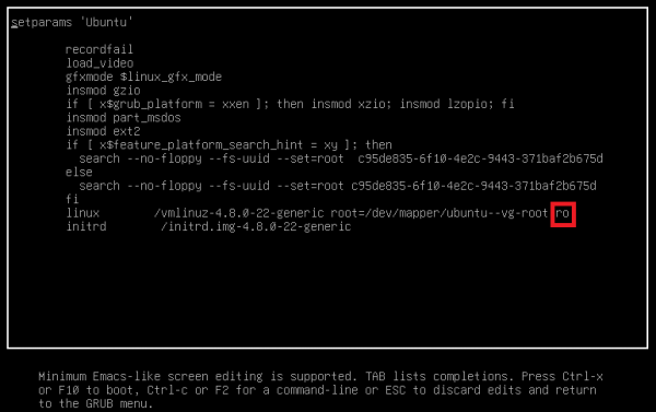 2. grub 부팅 화면에서 Ubuntu 선택 후 e 입력 ![]() 3. linux 라인의 ro 찾아가기 ![]()