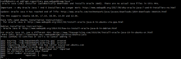 d. oracle-java8 설치 root@ubuntu:~# apt-get install oracle-java8-installer Reading package lists... Done Building dependency tree Reading state information... Done Package oracle-java8-installer is not available, but is referred to by another package. This may mean that the package is missing, has been obsoleted, or is only available from another source E: Package 'oracle-java8-installer' has no installation candidate root@ubuntu:~# apt-get install software-properties-common Reading package lists... Done Building dependency tree Reading state information... Done software-properties-common is already the newest version (0.96.20.7). The following packages were automatically installed and are no longer required: linux-headers-4.4.0-31 linux-headers-4.4.0-31-generic linux-image-4.4.0-31-generic linux-image-extra-4.4.0-31-generic Use 'apt autoremove' to remove them. 0 upgraded, 0 newly installed, 0 to remove and 1 not upgraded. root@ubuntu:~# add-apt-repository ppa:webupd8team/java Oracle Java (JDK) Installer (automatically downloads and installs Oracle JDK8). There are no actual Java files in this PPA. Important -> Why Oracle Java 7 And 6 Installers No Longer Work: http://www.webupd8.org/2017/06/why-oracle-java-7-and-6-installers-no.html The PPA supports Ubuntu 18.04, 17.10, 16.04, 14.04 and 12.04. More info (and Ubuntu installation instructions): - for Oracle Java 8: http://www.webupd8.org/2012/09/install-oracle-java-8-in-ubuntu-via-ppa.html Debian installation instructions: - Oracle Java 8: http://www.webupd8.org/2014/03/how-to-install-oracle-java-8-in-debian.html For Oracle Java 10, see a different PPA: https://www.linuxuprising.com/2018/04/install-oracle-java-10-in-ubuntu-or.html More info: https://launchpad.net/~webupd8team/+archive/ubuntu/java Press [ENTER] to continue or ctrl-c to cancel adding it gpg: requesting key EEA14886 from hkp server keyserver.ubuntu.com gpg: key EEA14886: public key "Launchpad VLC" imported gpg: no ultimately trusted keys found gpg: Total number processed: 1 gpg: imported: 1 (RSA: 1) OK ![]()