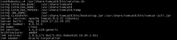 2. tomcat 8 설치 a. tomcat 8 설치root@ubuntu:~# apt-get install tomcat8 b. tomcat 버전 확인root@ubuntu:~# apt-get install tomcat8 root@ubuntu:~# /usr/share/tomcat8/bin/version.shUsing CATALINA_BASE: /usr/share/tomcat8 Using CATALINA_HOME: /usr/share/tomcat8Using CATALINA_TMPDIR: /usr/share/tomcat8/temp Using JRE_HOME: /usrUsing CLASSPATH: /usr/share/tomcat8/bin/bootstrap.jar:/usr/share/tomcat8/bin/tomcat-juli.jar Server version: Apache Tomcat/8.0.32 (Ubuntu)Server built: May 28 2018 17:21:29 UTC Server number: 8.0.32.0OS Name: Linux OS Version: 4.4.0-128-genericArchitecture: amd64 JVM Version: 1.8.0_171-8u171-b11-0ubuntu0.16.04.1-b11JVM Vendor: Oracle Corporation ![]()