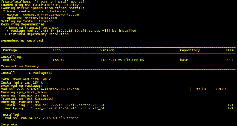 1. 필요패키지 설치 (openssl과 mod_ssl이 필요하나 6.4 이후 버전은 openssl이 설치되어있어 mod_ssl만 설치) yum -y install mod_ssl ![]()
