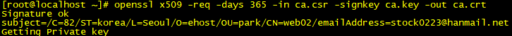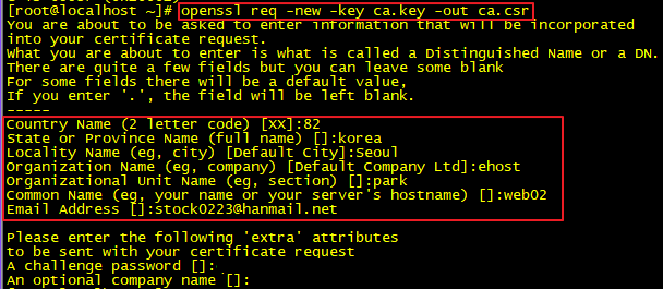 3. CSR (Certificate Signing Request) 생성 / Common Name의 경우 추후 conf파일 설정에 필요 [root@localhost ~]# openssl genrsa -out ca.key 1024 Generating RSA private key, 1024 bit long modulus .............++++++ .......................................++++++ e is 65537 (0x10001) [root@localhost ~]# openssl req -new -key ca.key -out ca.csr You are about to be asked to enter information that will be incorporated into your certificate request. What you are about to enter is what is called a Distinguished Name or a DN. There are quite a few fields but you can leave some blank For some fields there will be a default value, If you enter '.', the field will be left blank. ----- Country Name (2 letter code) [XX]:82 State or Province Name (full name) []:korea Locality Name (eg, city) [Default City]:Seoul Organization Name (eg, company) [Default Company Ltd]:ehost Organizational Unit Name (eg, section) []:park Common Name (eg, your name or your server's hostname) []:web02 Email Address []:stock0223@hanmail.net