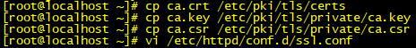5. 생성된 파일 복사 [root@localhost ~]# cp ca.crt /etc/pki/tls/certs [root@localhost ~]# cp ca.key /etc/pki/tls/private/ca.key [root@localhost ~]# cp ca.csr /etc/pki/tls/private/ca.csr ![]()