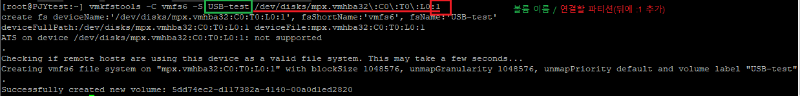 5. 파티션 포맷 및 마운트 ~#] vmkfstools -C vmfs6 -S USB-test /dev/disks/mpx.vmhba32:C0:T0:L0:1 ![]() 5-1. 스토리지 확인 ![]() |