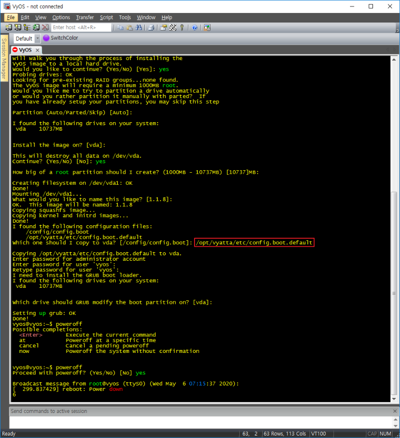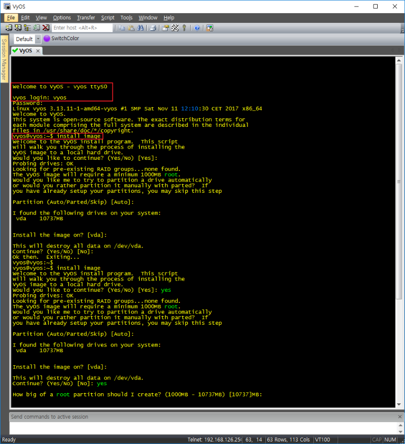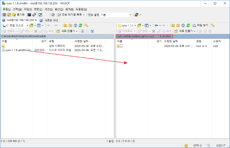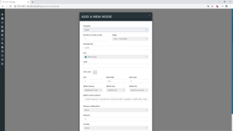 2) 디렉토리 생성 및 이동 ![]() 3) WinSCP를 이용한 ISO파일 이동 ![]() 4) ISO rename ![]() 5) image HDD 생성 ![]() 6-1) Vyos Node 추가 ![]() 6-2) Vyos Node 추가 ![]() 7-1) Vyos 로그인 및 이미지 설치 (ID/PW: vyos / vyos) ![]() 7-2) Vyos 로그인 및 이미지 설치 (ID/PW: vyos / vyos) ![]()