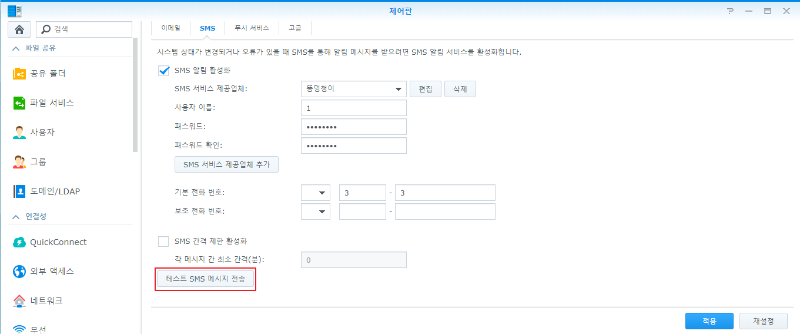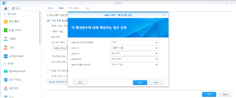![]() 5) 브라우저 새로고침 및 ID확인 ![]() 6-1) synology 설정 ![]() 6-2) synology 설정 ![]() https://api.telegram.org/bot[token]/sendmessage?chat_id=[id]&user=1&pass=2&phone=3&text="hello world" [token], [id] 괄호 포함해서 2, 5에서 확인한 token 및 id값 대체하여 입력6-3) synology 설정 ![]() 그림과 동일하게 설정 6-4) synology 설정 및 테스트 ![]()