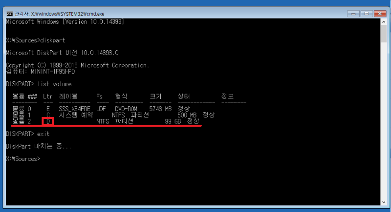 드라이브 문자 확인(예시에선 D:\)