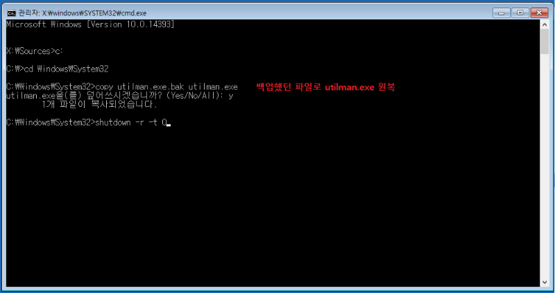 utilman.exe -> 백업파일로 덮어쓰기
