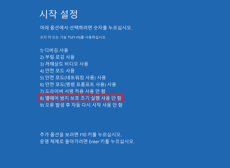 숫자 8입력 (멀웨어 방지 보호 조기 실행 사용 안 함)