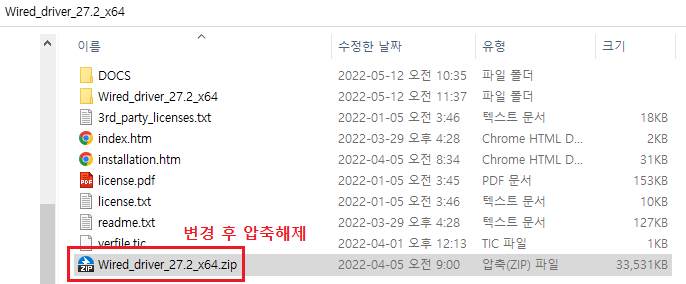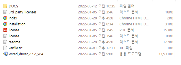 다운받은 드라이버 파일 압축 해제 시 상단과 같이 exe 파일이 있으며